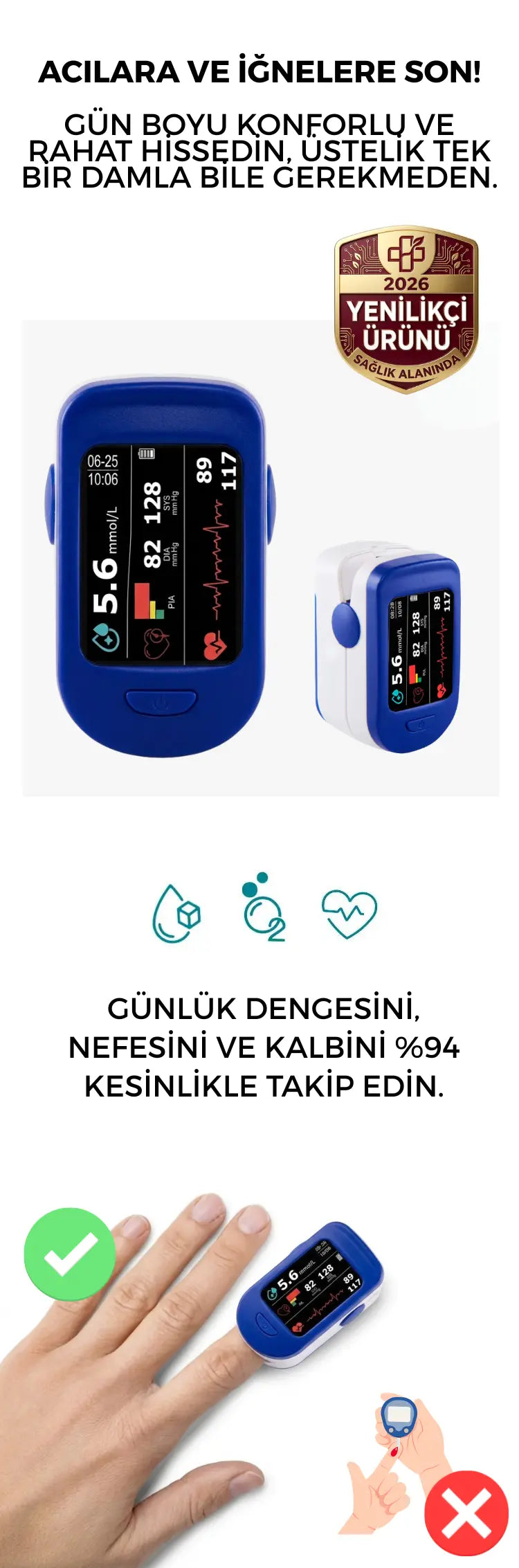 • İğnesiz – Parmak Delme Yok